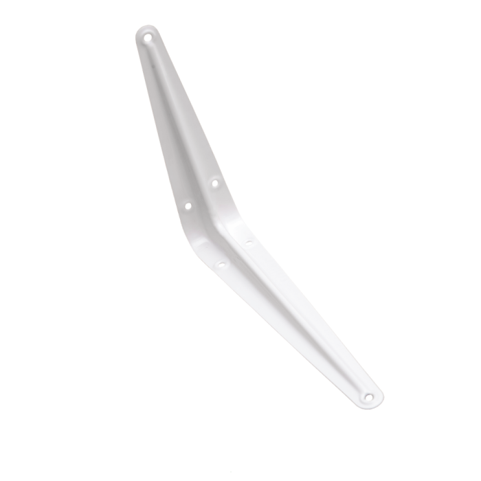 Кронштейн  представляет собой уголок с разными по длине сторонами, зауженными и закругленными концами. На каждом конце, а также на боковых сторонах крепежа, расположены монтажные отверстия . По всей длине уголка проходит сплошное ребро жесткости. Изделие изготовлено из стали. Стойкая и долговечная полимерная краска  защищает его от коррозии и придает кронштейну эстетически привлекательный вид. Кронштейн предназначен для безопасного крепления подвесных полок к стене разного назначения: книжных, для кухонной утвари и инструмента.